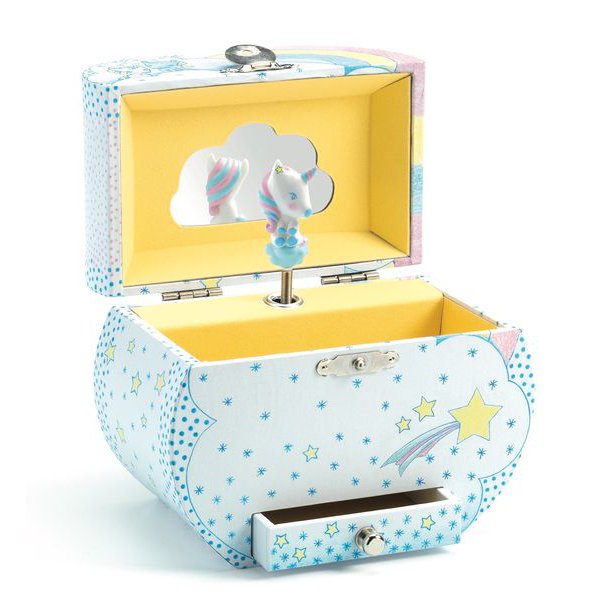 Carillon Djeco con carica manuale, quando parte la musica l’unicorno all’interno inizia a girare.
