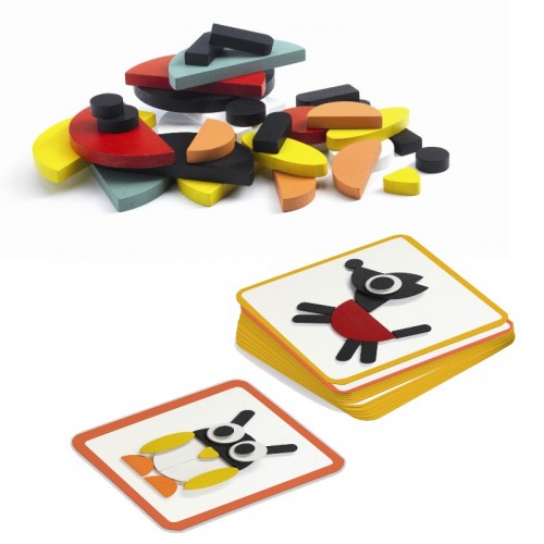 Gioco di costruzione con 30 forme di legno colorate che consentono di realizzare tanti animaletti.